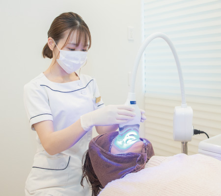 ホワイトニング剤を塗布した後、LEDライトを照射して、黄ばみの原因となる着色物質を分解します。LED照射は8分間行い、さらに薬剤を塗布して再度照射します。 この照射により、より短時間で理想的な白さを実現し、持続的な効果を得ることができます。