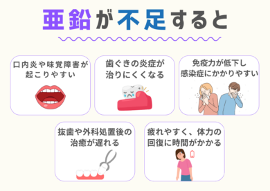 亜鉛が不足すると味覚障害や口内炎が起こりやすくなり、免疫力の低下を招きます。