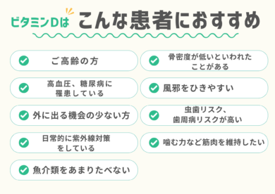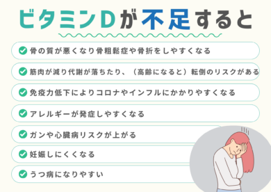 不足すると骨の質が弱くなるだけでなく、免疫力低下による感染症リスクの上昇や、アレルギーの悪化につながる可能性もあります。