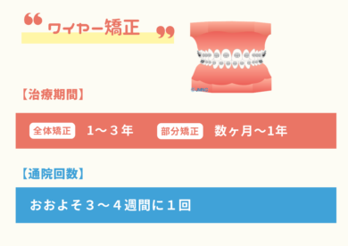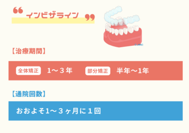 いずれの方法も、治療の範囲が限られる部分矯正は全体矯正よりも期間が短くなります。