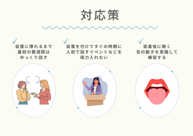 このため、装着直後は口の中が狭く感じたり、舌先に違和感を覚えたり飲食や話す際に一時的に違和感を感じ、口の動きがぎこちなくなる場合もあります。