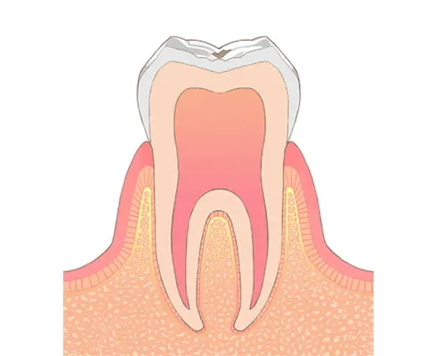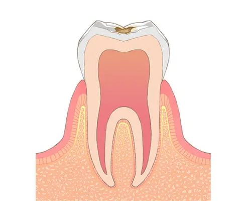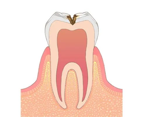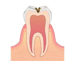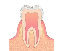 エナメル質の下にある象牙質まで虫歯が進行した状態です。冷たいものがしみたり、食べ物が詰まったりする症状がみられます。範囲が小さい場合はコンポジットレジンで処置し、範囲が大きい場合は詰め物や被せ物で修復します。