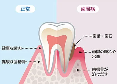 歯周病は、口腔内の細菌によって歯を支えている歯ぐきや骨が壊されていく病気です。