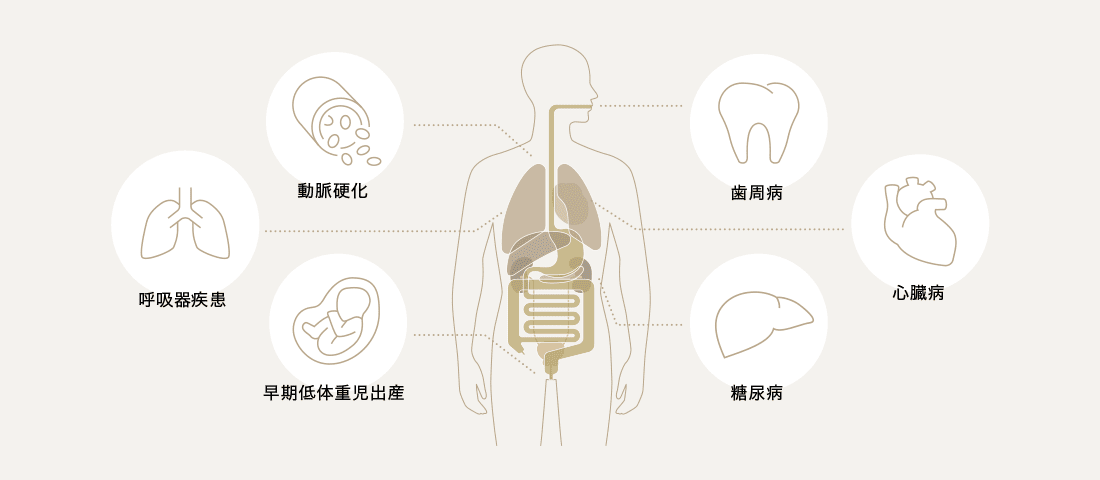 また、歯周病菌が心疾患や脳梗塞、糖尿病、早産などの全身疾患を引き起こす要因となっていることも報告されています。